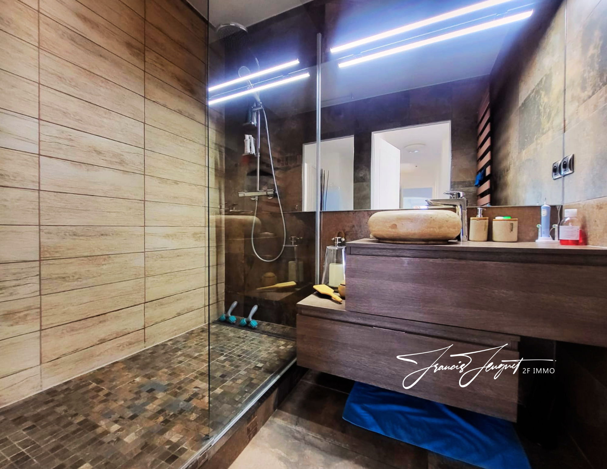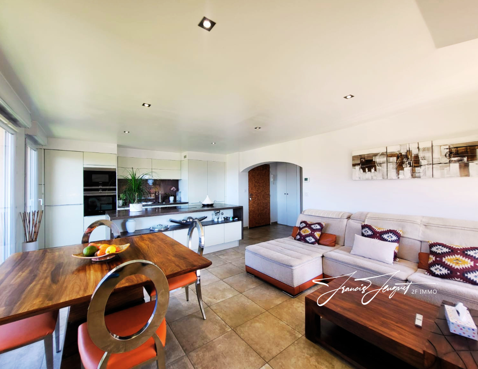 Dès l’entrée, un placard vous accueille (oui, lui aussi fait sa part du travail). L’espace de vie, lumineux et convivial, réunit une cuisine MOBALPA ouverte, un salon et une salle à manger. C’est le genre de pièce où l’on se voit déjà cuisiner, rire, recevoir… ou simplement ne rien faire, mais avec style.